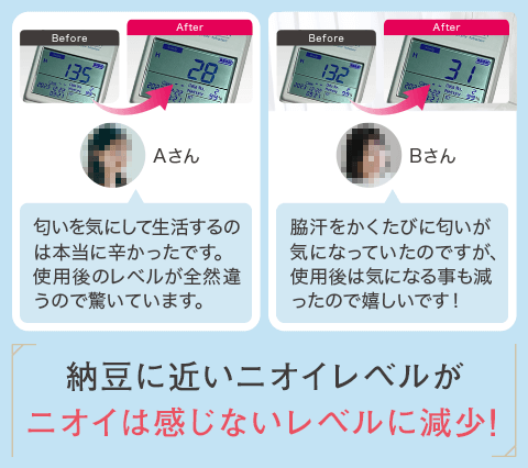 また、香りつきの製品を選んでしまいますと、ワキガ臭と香料が混じり合って悪臭となることがあるため、無香料タイプがおススメです。