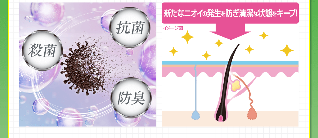 薬用有効成分をデオドラントベール内部に閉じ込めるので、長時間たってもデオドラント効果が持続します。