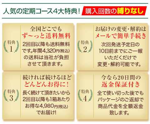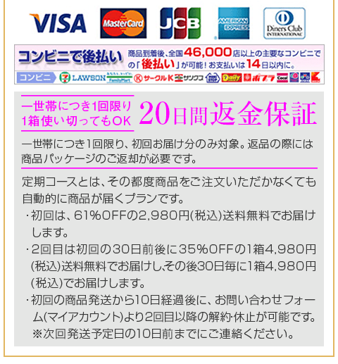 ご使用頂き、万が一ご満足いただけない場合は、返品依頼フォーム(こちら)に従い、必要一式を初回商品到着後20日以内に当社指定倉庫にご返品頂ければ、お客様よりご指定頂いた口座に商品代金を30日以内に返金させて頂きます。
