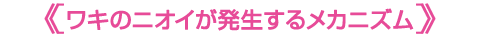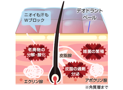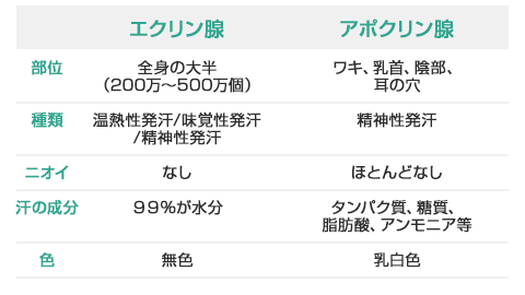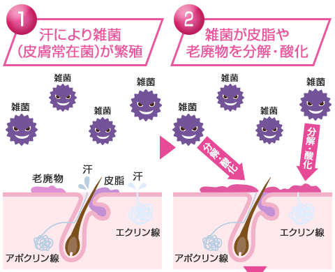 エクリン腺から分泌される汗は、雑菌が皮脂を分解することでニオイを発生させ、いわゆる「汗くささ」の原因となり、アポクリン腺から分泌される汗は、老廃物(タンパク質)や脂肪酸などが雑菌により分解・酸化されることで、特有のニオイを発生させます。