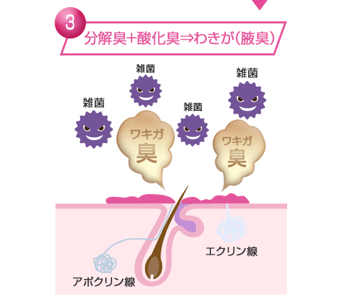 ワキには「エクリン腺」と「アポクリン腺」から分泌される2種類の汗があり、それぞれ異なる成分を含んでいるのですが、どちらも「汗により繁殖した雑菌(皮膚常在菌)が原因でニオイを発生させる」という点で共通しています。