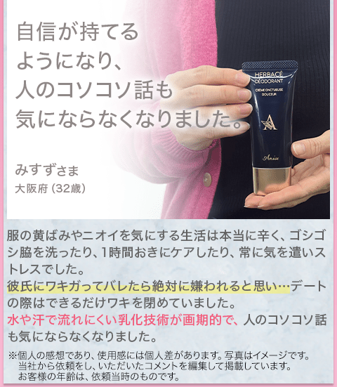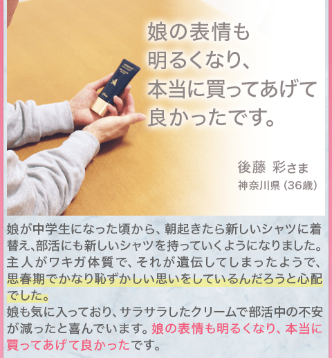 また、香りつきの製品を選んでしまいますと、ワキガ臭と香料が混じり合って悪臭となることがあるため、無香料タイプがおススメです。