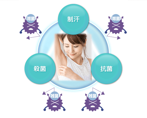 つまり、「制汗」×「殺菌」×「抗菌」3つの対策を合わせて行うことで、雑菌が繁殖しにくい環境になるのです‼