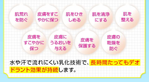 デオドラントベールを形成する乳化技術で、ベタつかずサラっと潤い、水や汗で流れにくい。