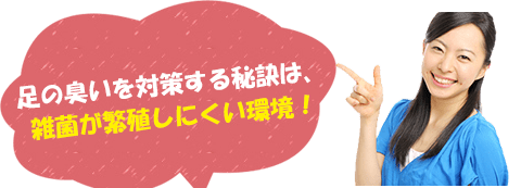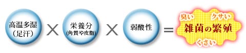 皮膚の表面は弱酸性、さらに体温と足汗により高温多湿状態になり、足の皮脂や垢・角質を栄養にする事により雑菌が繁殖するのです。