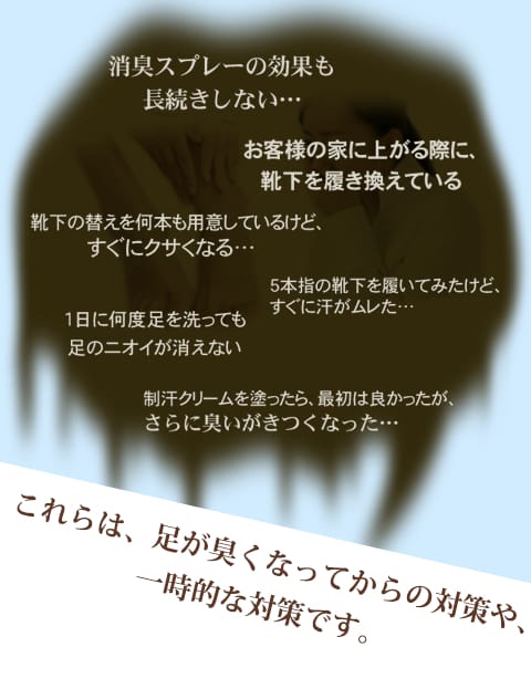 今も、“足の臭いで悩んでいる方”、“足の臭いが解決する事を半分諦めている方”もう、人目を気にしたり、一時的な効果しか得れない消臭グッズを使用する必要はありません。