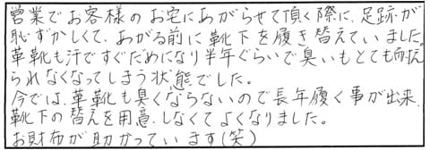 営業でお客様のお宅にあがらせて頂く際に、足跡が恥ずかしくて、あがる前に靴下を履き替えていました。革靴も汗ですぐだめになり半年ぐらいで臭いもとても耐えられなくなってしまう状態でした。