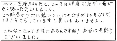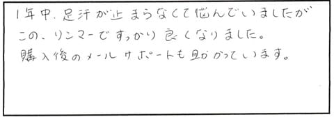 1年中、足汗が止まらなくて悩んでいましたが この、リンマーですっかり良くなりました。購入後のメールサポートも助かっています。