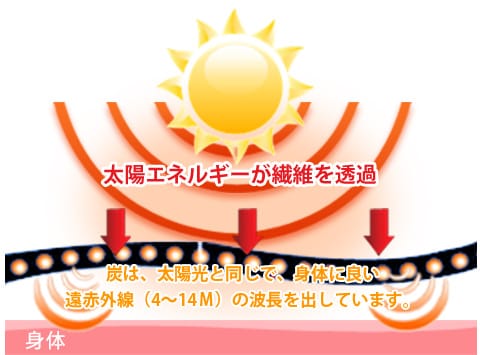 炭には遠赤外線を放射する性質があり、この遠赤外線の性質により、ゆっくりと身体の芯まで温める事が出来るのです。