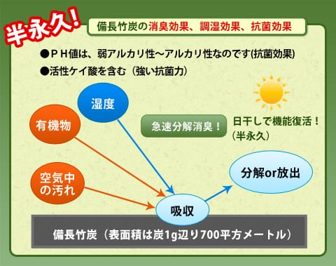 竹炭は、日干しなどを行うと吸着していたものを放出する特性があります。つまり、活性炭とは異なり空気中の湿気や雑菌のエサとなる汚れを、一度吸着しても日干しを行う事で、半永久的に使用する事が出来るのです。