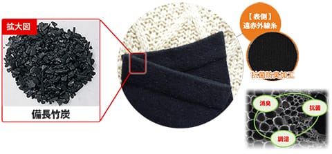 繊維には、備長竹炭のマイクロカプセルが練りこまれています。